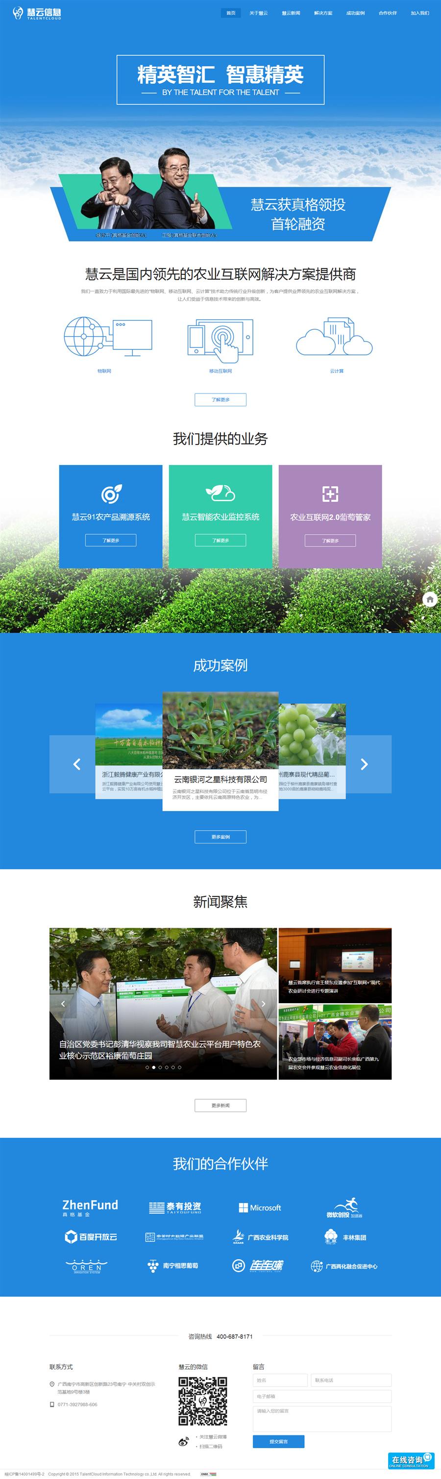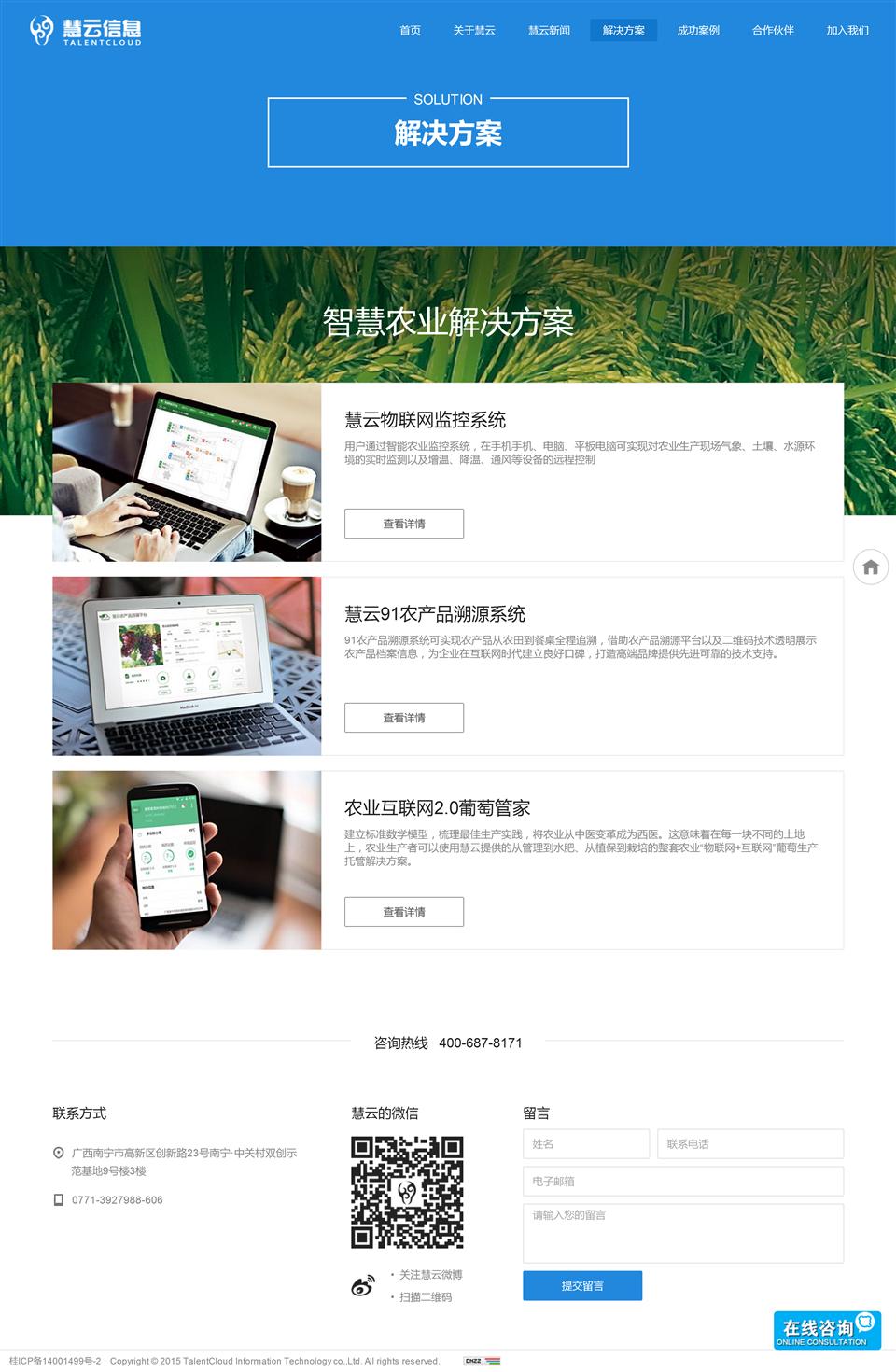 廣西慧云信息技術(shù)有限公司于2012年創(chuàng)立,旨在利用國(guó)際領(lǐng)先的物聯(lián)網(wǎng)、移動(dòng)互聯(lián) 網(wǎng)、云計(jì)算等信息技術(shù)改造、創(chuàng)新、變革傳統(tǒng)農(nóng)業(yè),將農(nóng)業(yè)物聯(lián)網(wǎng)與農(nóng)業(yè)生產(chǎn)技術(shù)深度 融合,打造現(xiàn)代農(nóng)業(yè)生產(chǎn)的全新模式,幫助農(nóng)業(yè)生產(chǎn)者大范圍提高農(nóng)產(chǎn)品的安全與品 質(zhì),實(shí)現(xiàn)農(nóng)業(yè)產(chǎn)值和利潤(rùn)的提升。