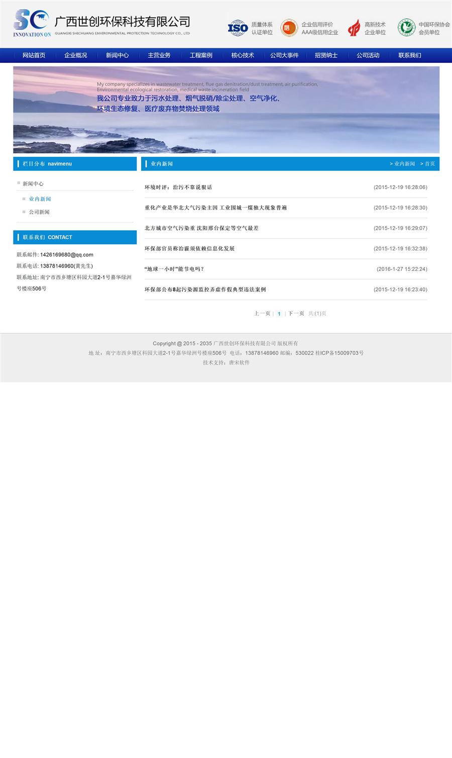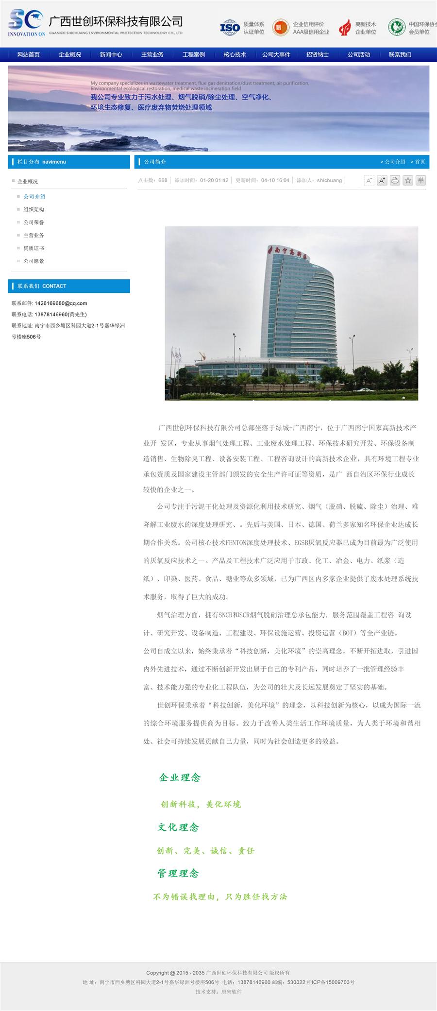 廣西世創(chuàng)環(huán)??萍加邢薰究偛孔溆诰G城-廣西南寧,位于廣西南寧國家高新技術產(chǎn)業(yè)開 發(fā)區(qū),專業(yè)從事煙氣處理工程、工業(yè)廢水處理工程、環(huán)保技術研究開發(fā)、環(huán)保設備制造銷售、生物除臭工程、設備安裝工程、工程咨詢設計的高新技術企業(yè),具有環(huán)境工程專業(yè)承包資質及國家建設主管部門頒發(fā)的安全生產(chǎn)許可證等資質,