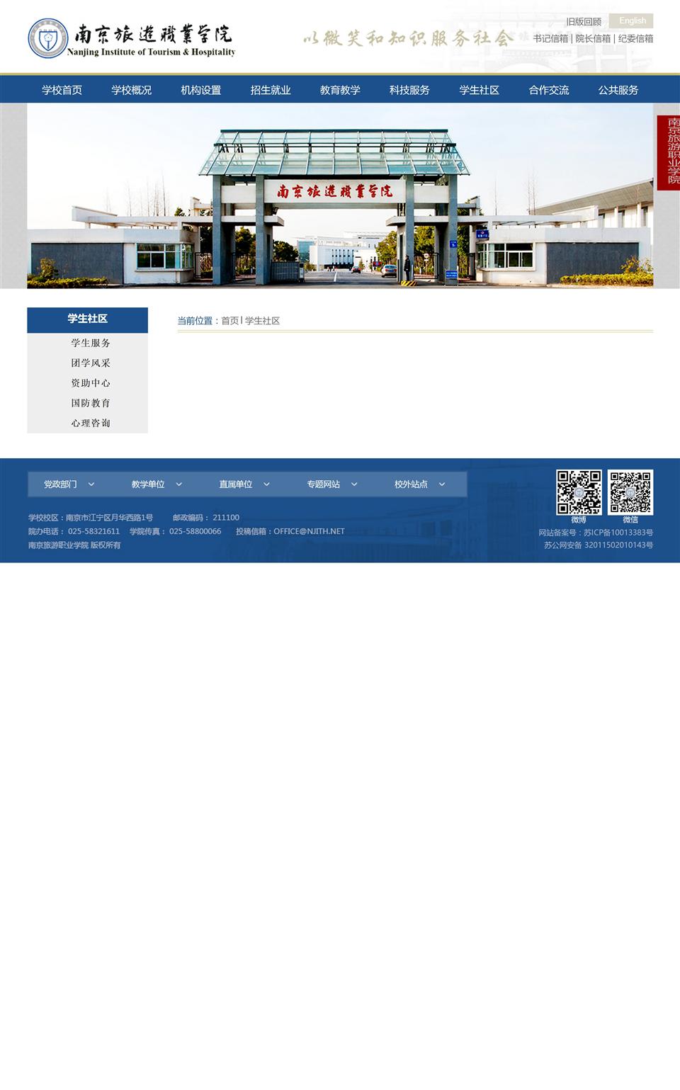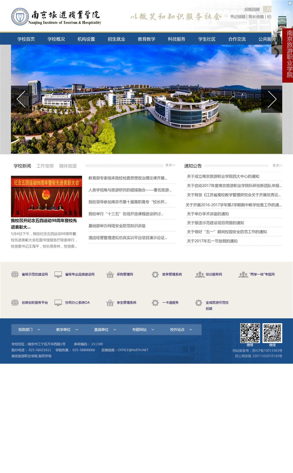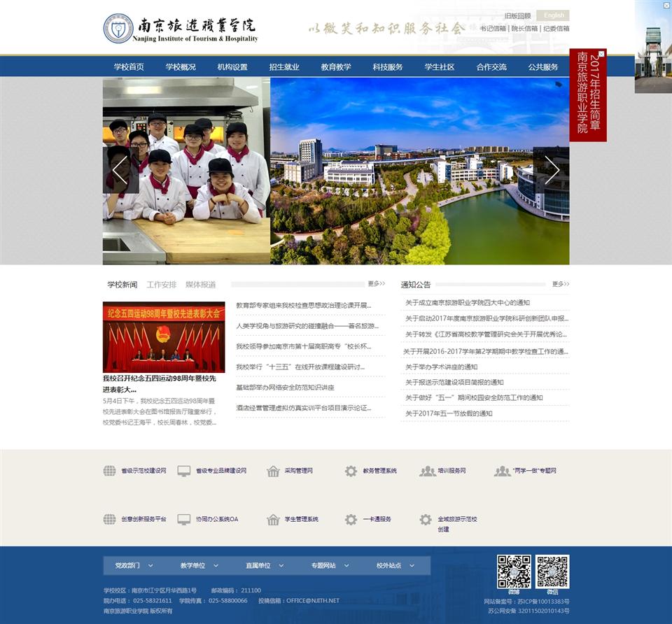 南京旅游職業(yè)學(xué)院坐落于十朝都會(huì)南京,依山(方山)傍水(秦淮河),風(fēng)景秀麗,人文薈萃,交通便捷。校內(nèi)建筑獨(dú)特,處處體現(xiàn)江南園林風(fēng)格。目前,學(xué)院擁有江寧和華嚴(yán)崗兩個(gè)校區(qū),占地546畝(含生態(tài)旅游實(shí)訓(xùn)基地120畝),校舍總面積近20萬平方米。校內(nèi)場館設(shè)施優(yōu)良,住宿條件優(yōu)越,現(xiàn)有館藏圖書30萬冊(cè),建有教學(xué)實(shí)習(xí)酒店1座,國家級(jí)實(shí)訓(xùn)基地1個(gè),省級(jí)實(shí)訓(xùn)基地2個(gè),現(xiàn)代化實(shí)驗(yàn)、實(shí)訓(xùn)室38個(gè)。