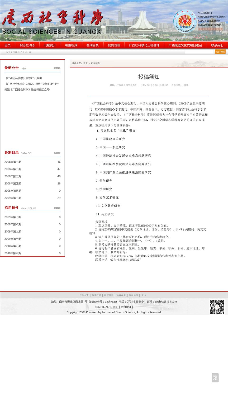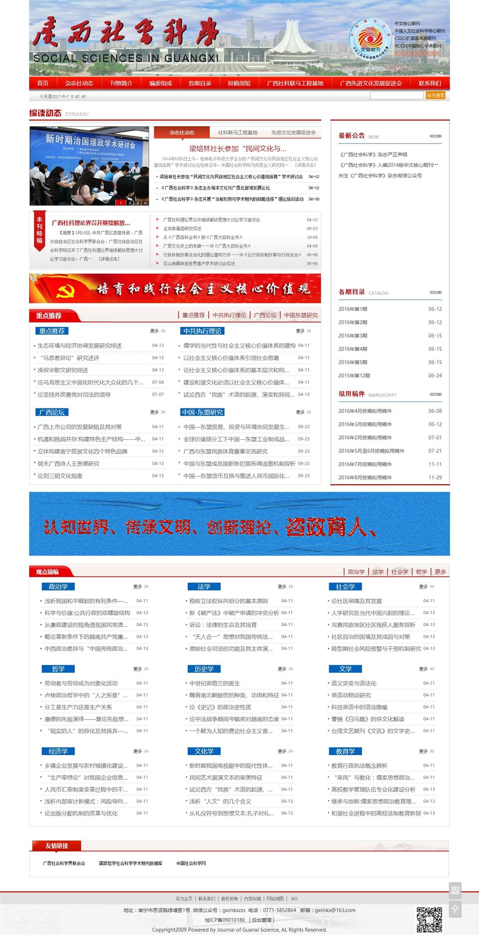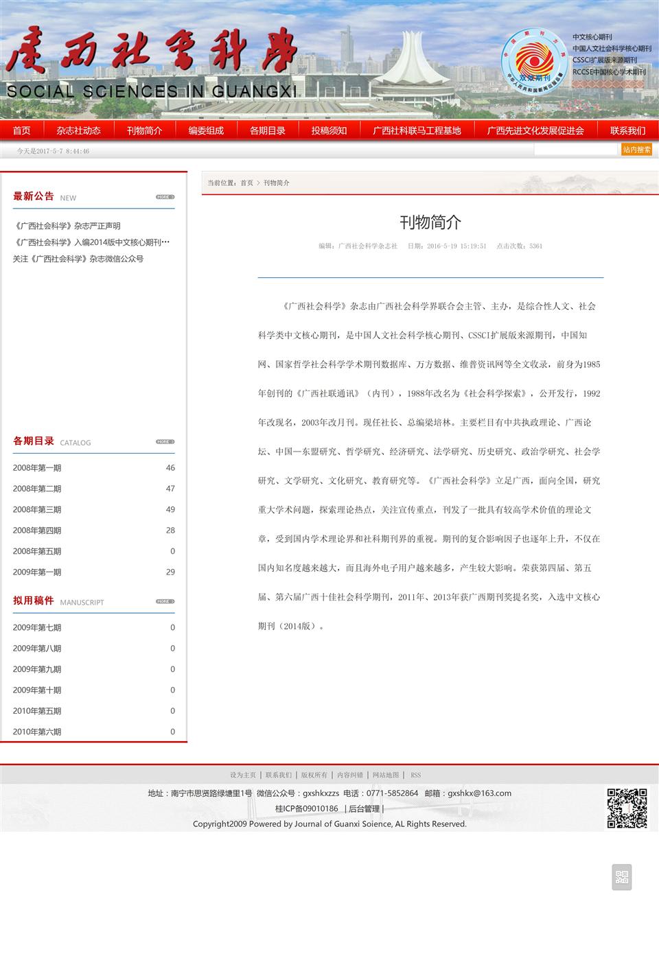 《廣西社會科學》雜志由廣西社會科學界聯(lián)合會主管、主辦,是綜合性人文、社會科學類中文核心期刊,是中國人文社會科學核心期刊、CSSCI擴展版來源期刊,中國知網(wǎng)、國家哲學社會科學學術期刊數(shù)據(jù)庫、萬方數(shù)據(jù)、維普資訊網(wǎng)等全文收錄,前身為1985年創(chuàng)刊的《廣西社聯(lián)通訊》(內刊),1988年改名為《社會科學探索》,公開發(fā)行,1992年改現(xiàn)名,2003年改月刊。