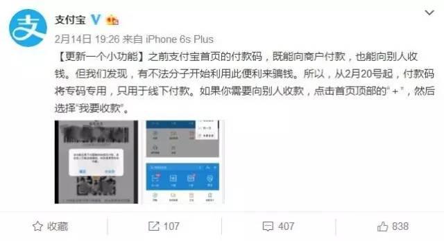 支付寶表明,此舉是因為之前支付寶主頁的付款碼,既能向商戶付款,也能向別人收錢。但支付寶發(fā)現(xiàn),有不法分子開端運用此便當(dāng)來騙錢。所以,從2月20號起,付款碼將專碼專用,只用于線下付款。